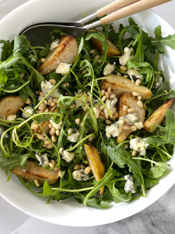 Смешайте в миске рукколу, грушу и обжаренные кедровые орехи.